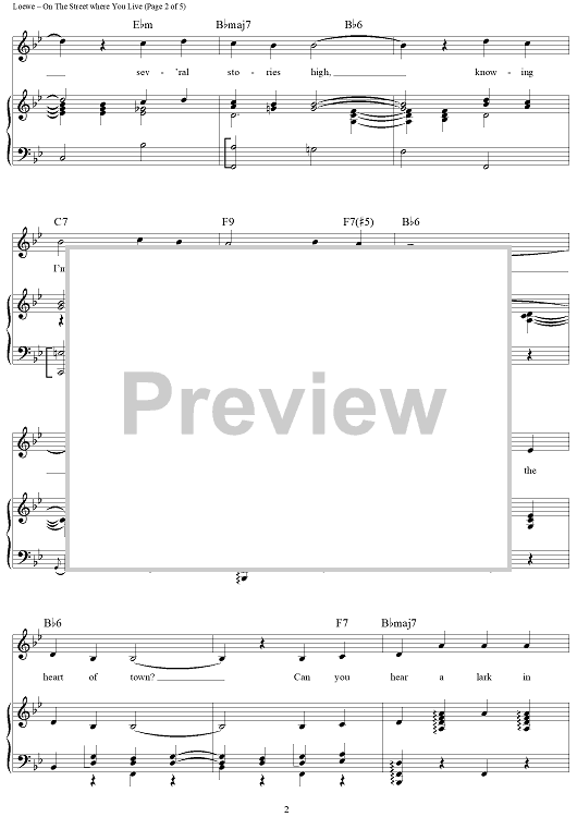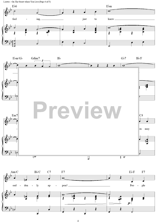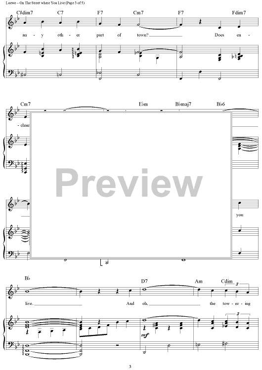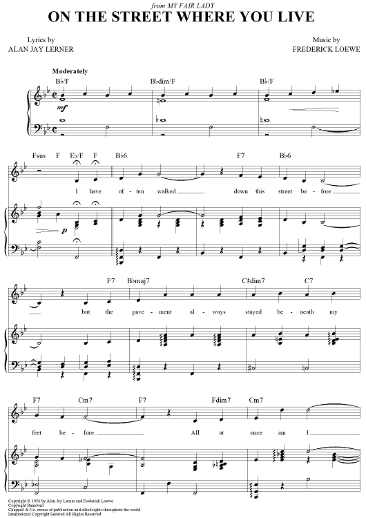 Digital Sheet Music for On The Street Where You Live by Andy Williams, Nat King Cole, Frederick Loewe, Alan Jay Lerner, Doris Day, Dennis DeYoung, Dean Martin, Vic Damone scored for Piano/Vocal/Chords; id:368217