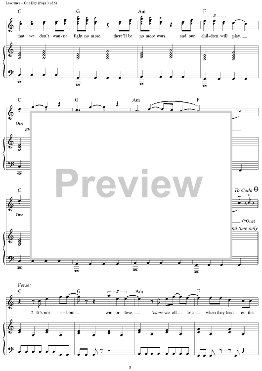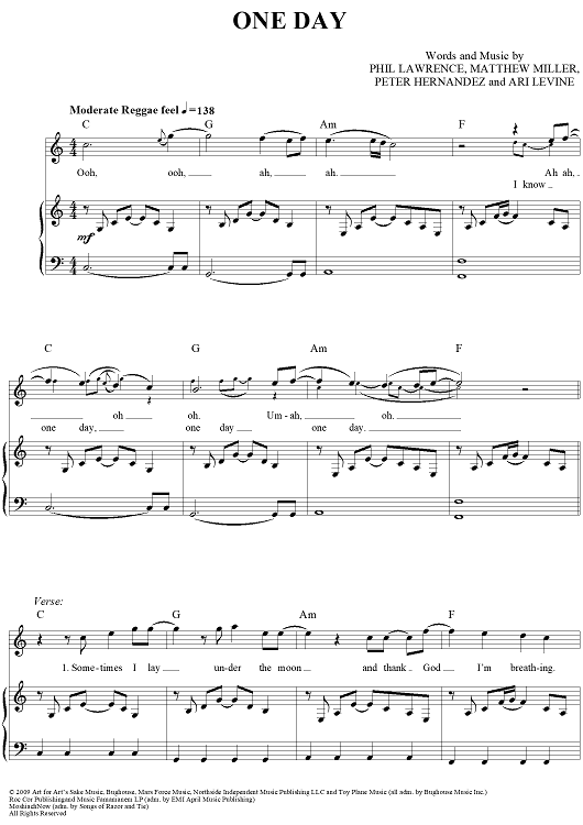Digital Sheet Music for One Day by Matthew Miller, Peter Hernandez, Ari Levine, Matisyahu, Philip Lawrence scored for Piano/Vocal/Chords; id:410871