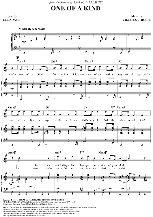 Digital Sheet Music for One of a Kind by Charles Strouse, Lee Adams scored for Piano/Vocal/Chords; id:259501