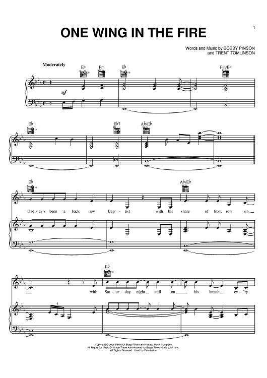Digital Sheet Music for One Wing In The Fire by Bobby Pinson, Trent Tomlinson scored for Piano/Vocal/Chords; id:394344