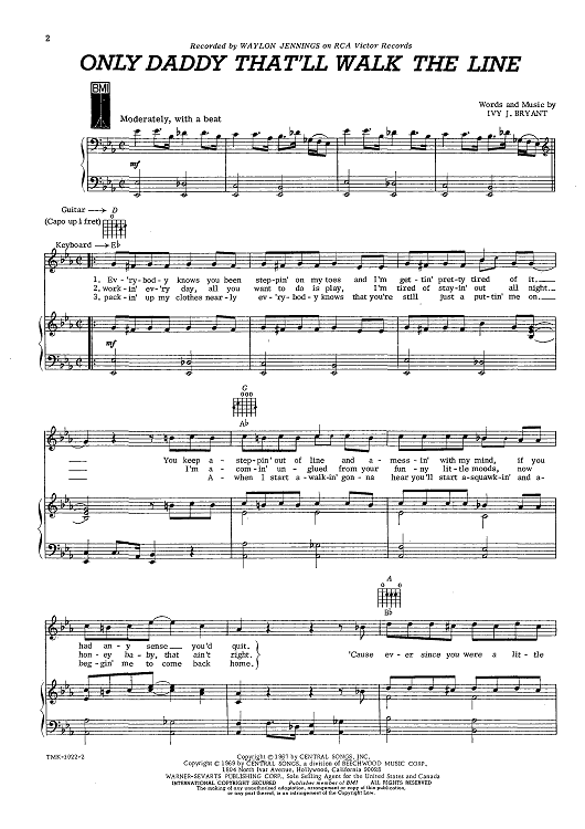 Digital Sheet Music for Only Daddy That'll Walk the Line by Waylon Jennings, Jimmy Bryant scored for Piano/Vocal/Chords; id:424224