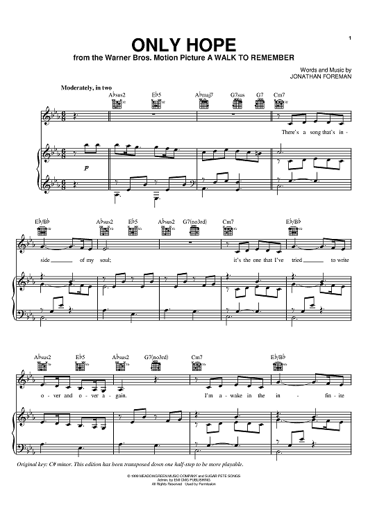 Digital Sheet Music for Only Hope by Mandy Moore, Jonathan Mark Foreman scored for Piano/Vocal/Chords; id:367633
