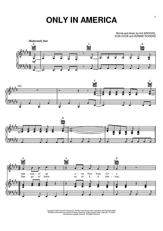 Digital Sheet Music for Only In America by Ronnie Rogers, Don Cook, Kix Brooks, Brooks & Dunn scored for Piano/Vocal/Chords; id:368547