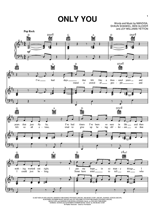 Digital Sheet Music for Only You by Ben Glover, Mandisa, Shaun Shankel, Joy Williams Yetton scored for Piano/Vocal/Chords; id:401040