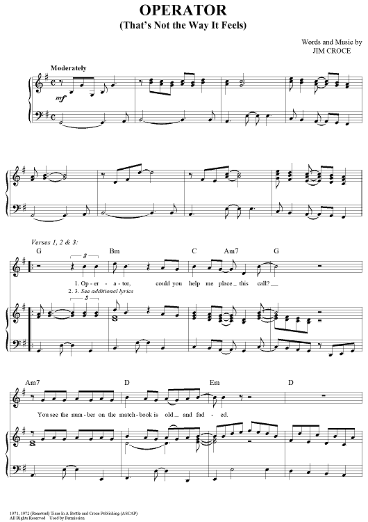 "Operator (That's Not the Way It Feels)" Sheet Music by Jim Croce