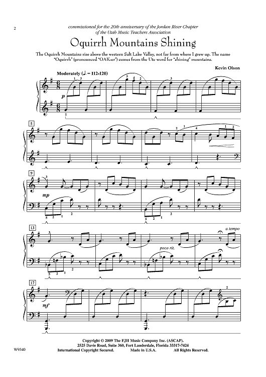 This late intermediate level solo was commissioned for the 20th anniversary of the Jordan River Chapter of the Utah Music Teachers Association. Oquirrh, pronounced "Oak-er" means shining mountains. This piece displays the image of these brilliant mountains through the continuing running eighth note patterns in both hands with splashes of color throughout.