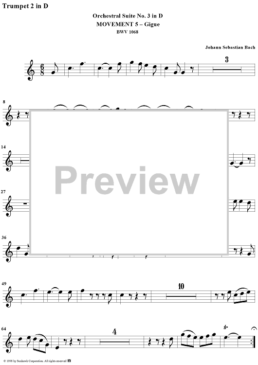 "Orchestral Suite No. 3, No. 5: Gigue in D - Trumpet 2" Sheet Music by Johann Sebastian Bach