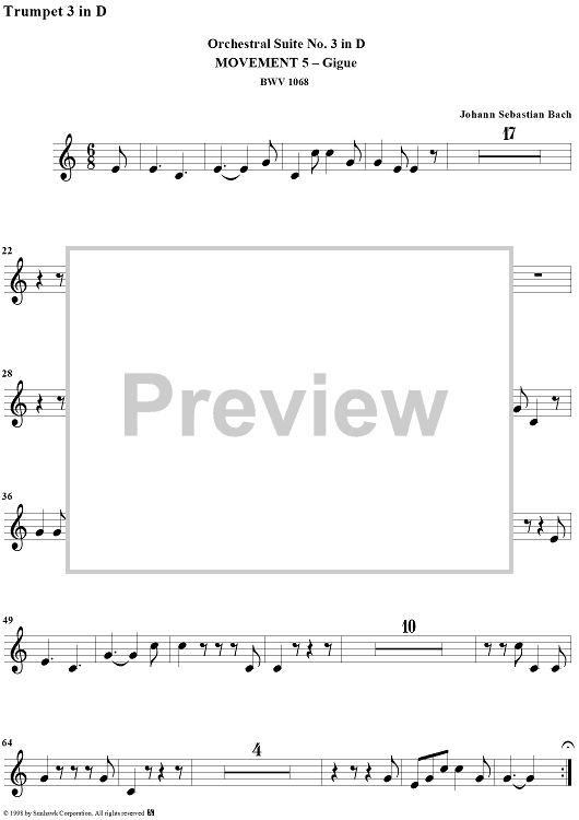"Orchestral Suite No. 3, No. 5: Gigue in D - Trumpet 3" Sheet Music by Johann Sebastian Bach