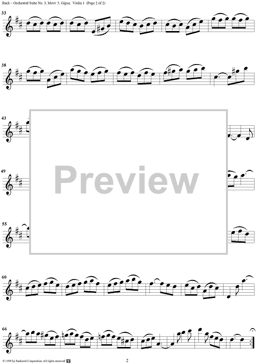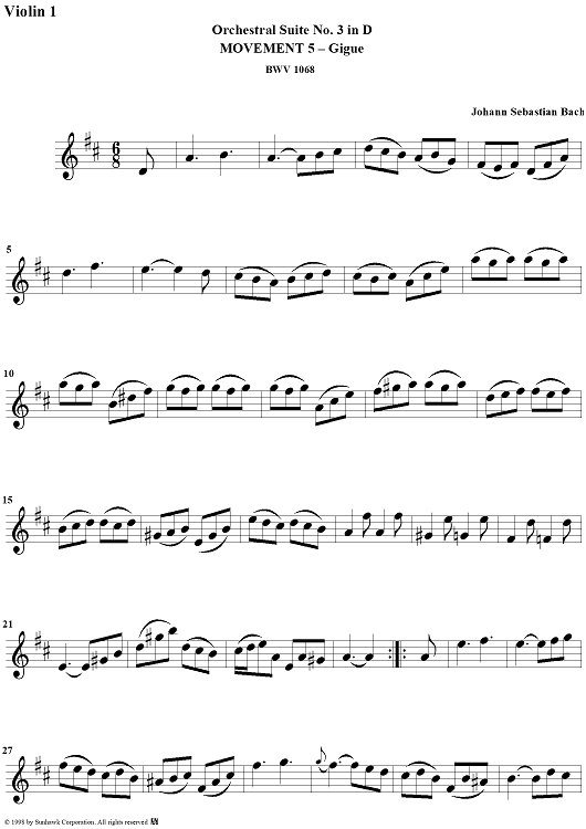 Digital Sheet Music for Orchestral Suite No. 3, No. 5: Gigue - Violin 1 by Johann Sebastian Bach scored for Chamber Orchestra; id:95827