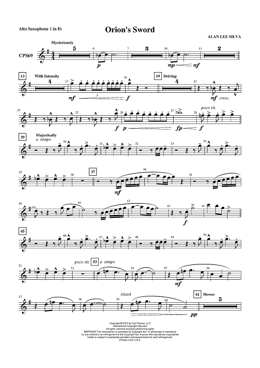 Digital Sheet Music for Orion`s Sword - Alto Sax 1 by Alan Lee Silva scored for Concert Band; id:407330