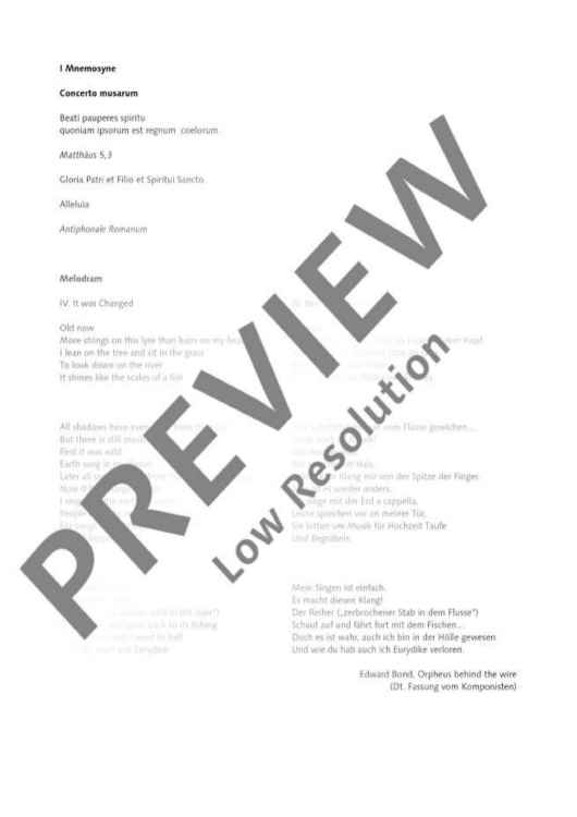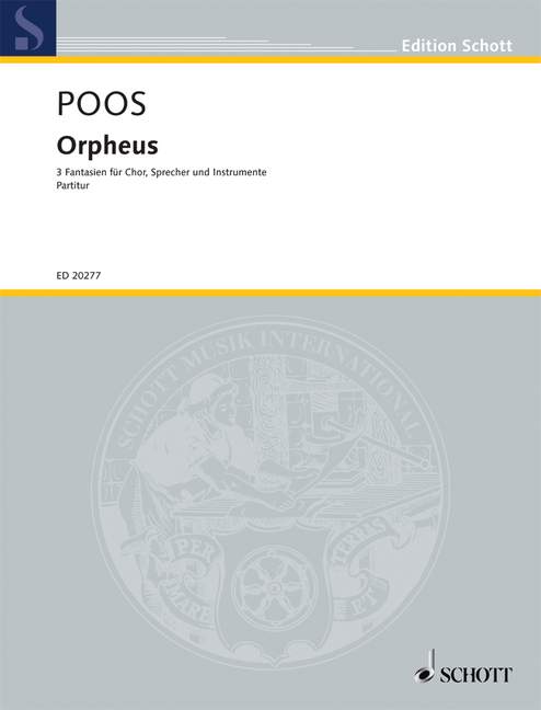 Heinrich Poos (born 1928) is one of the great German composers of choral music of our time. In his 'Orpheus' cycle, Poos takes up the ancient myth of the singer and poet Orpheus who is a symbol of the power of music. The three-part work is based on texts from classical antiquity, the Middle Ages and the present time which are all dealing with the issue of 'music', texts by Plato, Virgil, Ovid, Shakespeare, Edward Bond. In addition to a powerful choir, the 40-minute work requires a narrator and a differentiated instrumental ensemble.