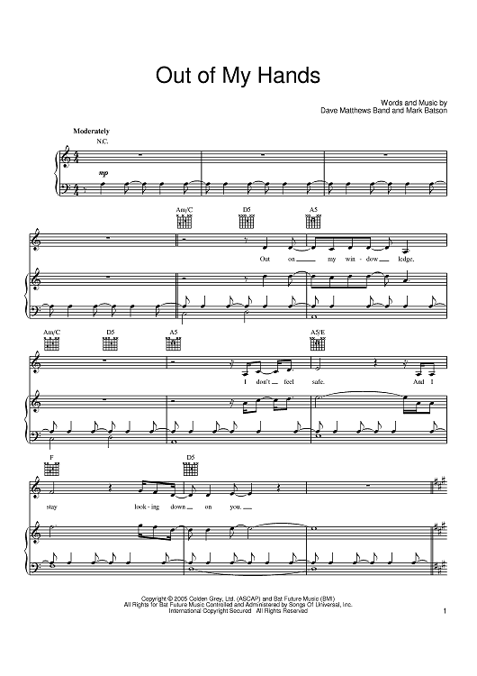 Digital Sheet Music for Out Of My Hands by Dave Matthews Band, Mark Batson scored for Piano/Vocal/Chords; id:401741