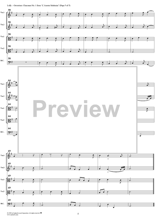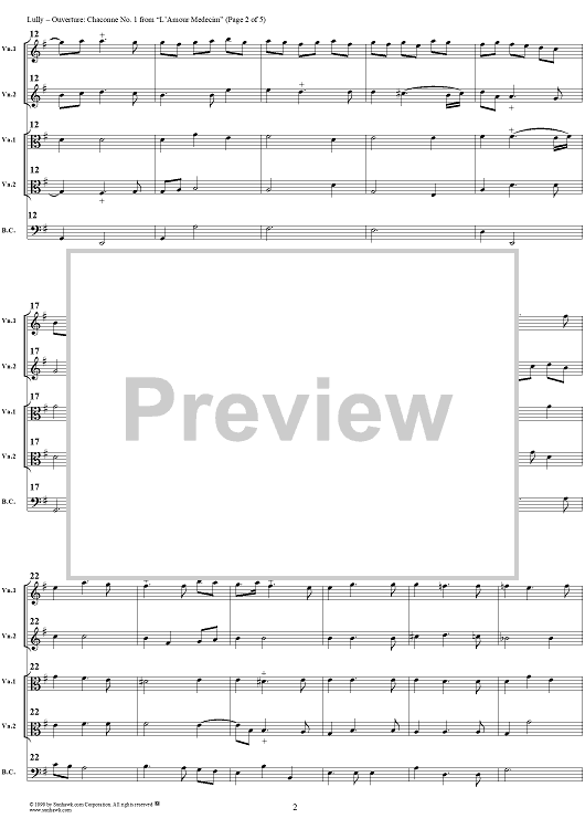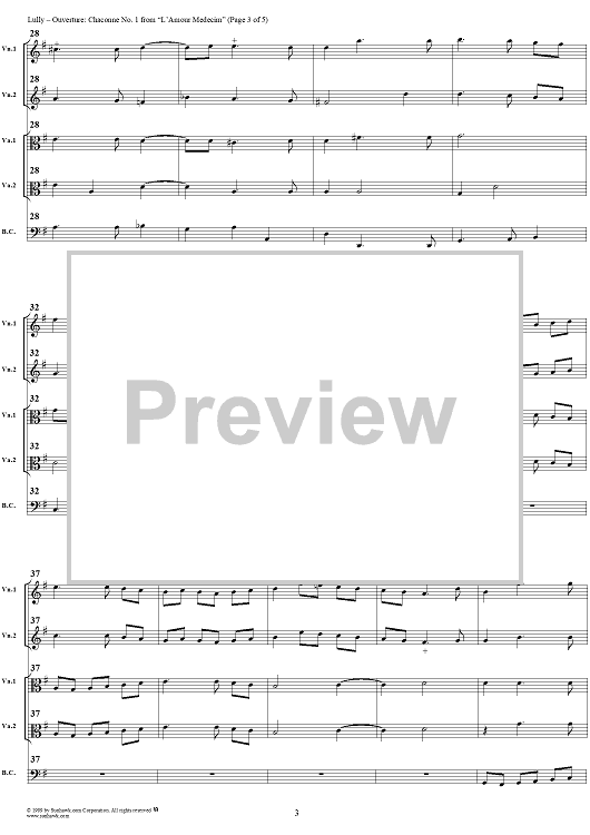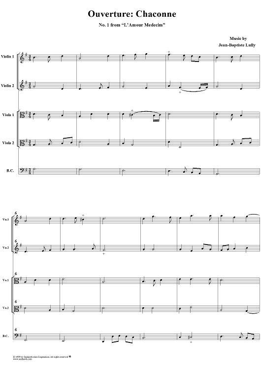 Digital Sheet Music for Ouverture, Chaconne - No. 1 from "L'Amour Médecin" - (LWV 29) - Score by Jean-Baptiste Lully scored for Two Violins/Two Violas/Continuo; id:250853