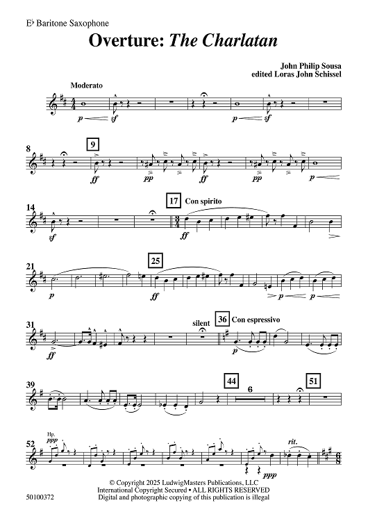 Digital Sheet Music for Overture: The Charlatan - Eb Baritone Saxophone by John Philip Sousa, Loras John Schissel scored for Concert Band; id:507395