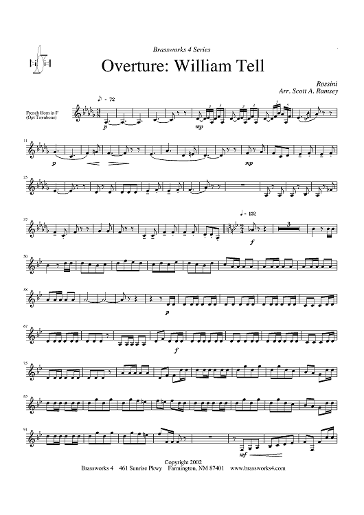 Digital Sheet Music for Overture: William Tell - Horn in F (opt. Trombone) by Gioachino Rossini, Scott A. Ramsey scored for Brass Quartet; id:317206
