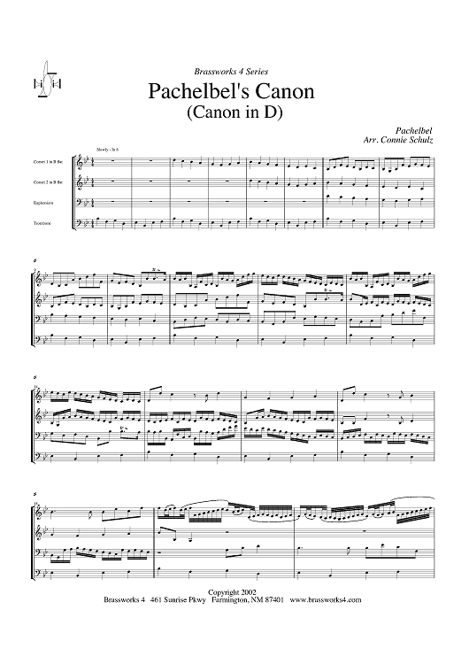 Digital Sheet Music for Pachelbel's Canon - Score by Johann Pachelbel, Connie Schulz scored for Brass Quartet; id:316766