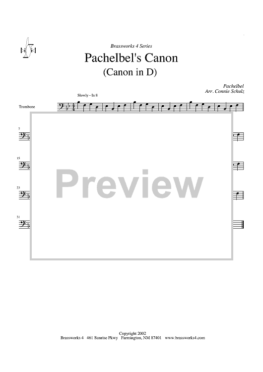 Digital Sheet Music for Pachelbel's Canon - Trombone by Johann Pachelbel, Connie Schulz scored for Brass Quartet; id:316769
