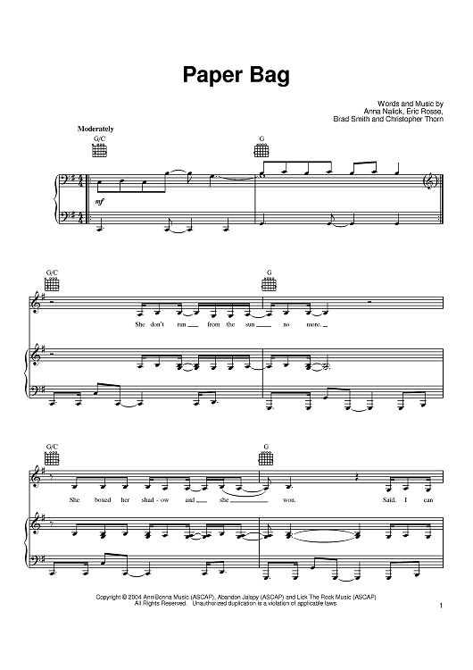 Digital Sheet Music for Paper Bag by Anna Nalick, Eric Rosse, Brad Smith, Christopher Thorn scored for Piano/Vocal/Chords; id:390673
