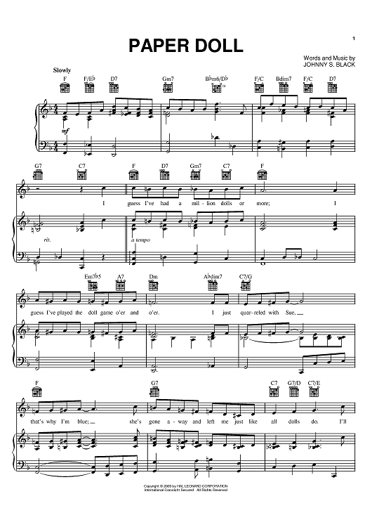 Digital Sheet Music for Paper Doll by Johnny S. Black, Mills Brothers, Lena Horne scored for Piano/Vocal/Chords; id:382153