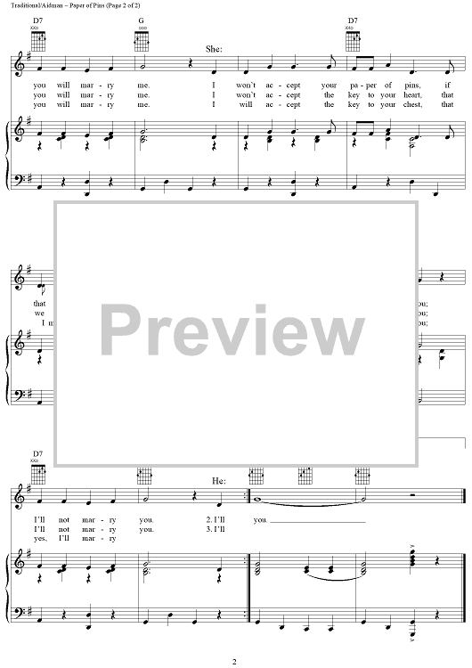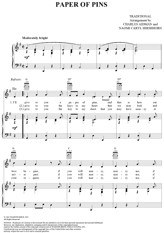 Digital Sheet Music for Paper of Pins by Charles Aidman, Naomi Caryl Hirshhorn, Traditional scored for Piano/Vocal/Chords; id:355705