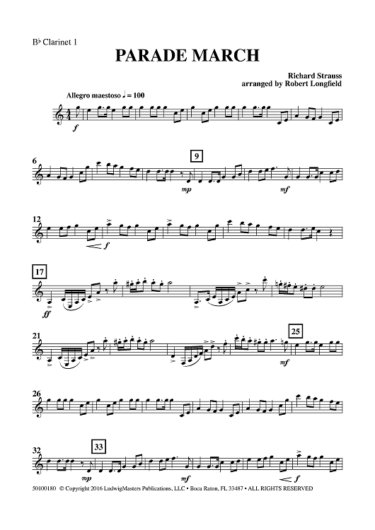 Digital Sheet Music for Parade March - Clarinet 1 in Bb by , Richard Strauss, Robert Longfield scored for Concert Band; id:461589