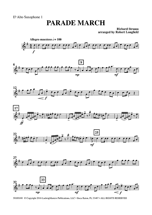 Digital Sheet Music for Parade March - Eb Alto Sax 1 by , Richard Strauss, Robert Longfield scored for Concert Band; id:461593