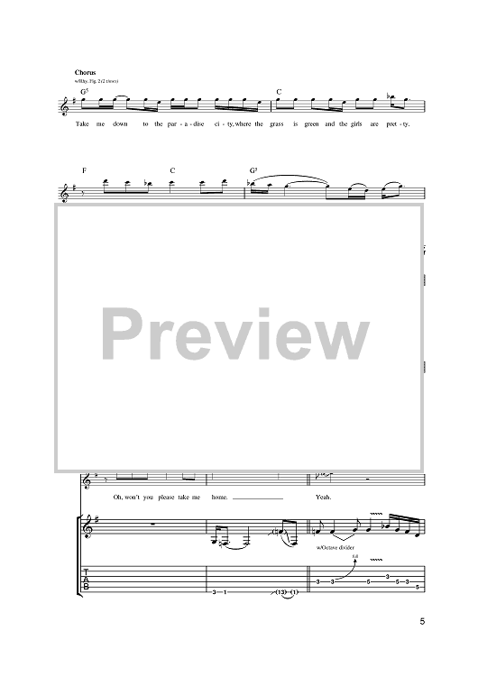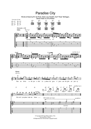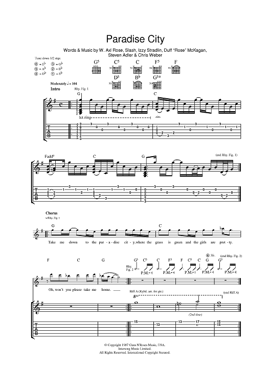 Digital Sheet Music for Paradise City by W. Axl Rose, Izzy Stradlin, Slash, Steven Adler, Guns N' Roses, Duff McKagan scored for Guitar Tab; id:396174