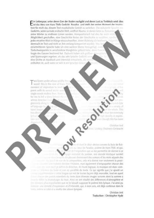 Ein Liebespaar, unter deren Gier der Boden nachgibt und deren Lust zu Treibholz wird: dies ist das Herz von Hans Thills Gedicht Paradox und stellt den ersten Moment der Inspiration für Christian Jost dar, diesem Text musikalische Gestalt zu verleihen. Die reduzierte Sprache des Gedichts, seine surreale erotische Welt, eröffnet Räume, in denen Sätze zu Romanen und einzelne Wörter zu endlosen Linien werden. Kompositorisch hat dies für Jost nicht nur die Möglichkeit geschaffen, eine Geschichte hinter der Geschichte zu erzählen, sondern auch jedes einzelen Wort in Klänge einzuschweißen, deren Richtung er bestimmt. Folgerichtig ist demnach im Text und nicht an ihm entlang komponiert worden. Was bedeutet: der ohnehin zerschnittenen Sprache wurde eine weitere Ebene hinzugefügt, indem die jeweiligen Textschwerpunkte in verschiedene Klangbilder gefasst wurden, deren Summe dann die Dramaturgie des Ganzen bestimmt hat. Dadurch haben sich größere atmosplärische Unterschiede und Spannungen ergeben, als das sehr lyrische Gedicht vermuten ließe. So aber konnte der Komponist eine Dichte an Ausdruck und Intensität entwickeln, die bereits im Text enthalten sind, auch wenn er sich in ein lyrisches Gewand verkleidet hat.