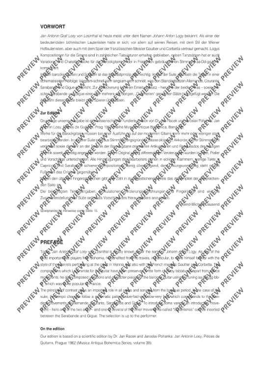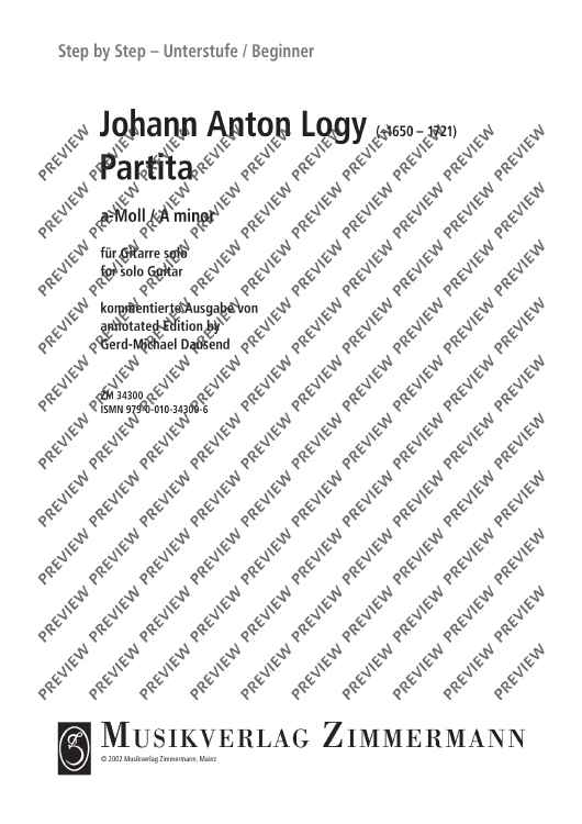 Jan Antonin Graf Losy von Losinthal is known under the name of Johann Anton Logy. He lived from around 1650 till 1721 and is considered one of the most important Bohemian lute players who became familiar with both the Viennese and the French style when travelling around. His compositions for the guitar have been preserved in the form of many tablatures. Apart from dance movements, he also composed variations and character pieces for the baroque guitar using the tuning aa-Dd-gg-bb-e', which was quite popular in France. This edition has been rearranged for the modern guitar and annotated (as are all books from the STEP BY STEP series) with detailed information on playing techniques. This makes it an excellent choice for introducing Baroque performance procedure.