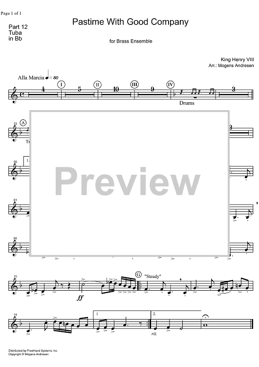 Digital Sheet Music for Pastime With Good Company - Tuba in B-flat BC by Mogens Andresen, Henry VIII scored for Brass Ensemble; id:327810