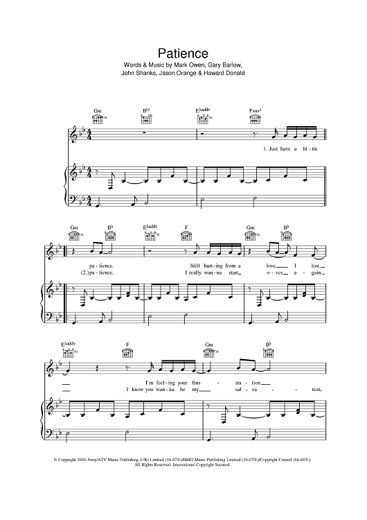 Digital Sheet Music for Patience by Gary Barlow, John Shanks, Take That, Mark Owen, Jason Orange, Howard Donald scored for Piano/Vocal/Chords; id:394514