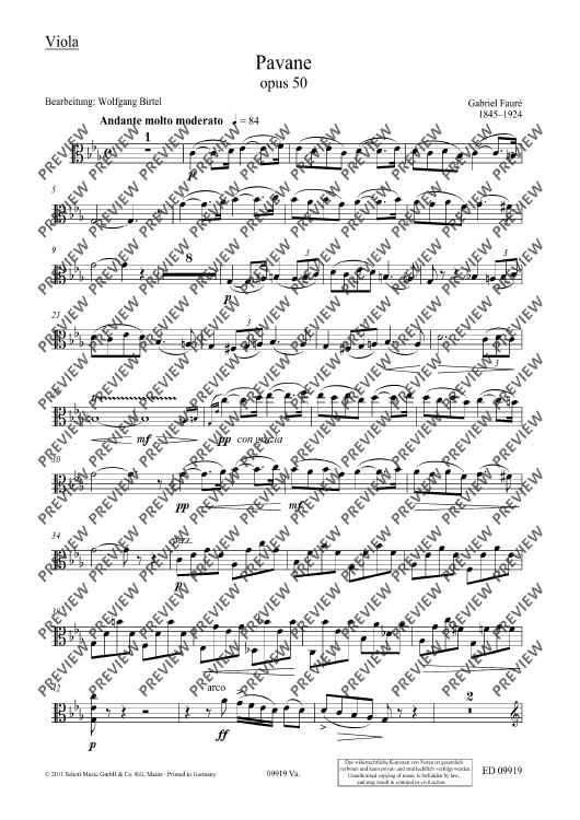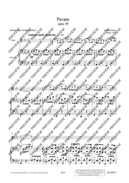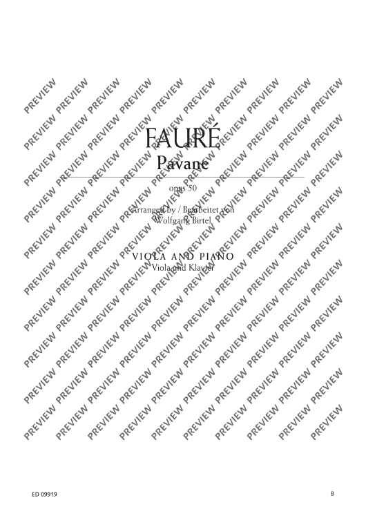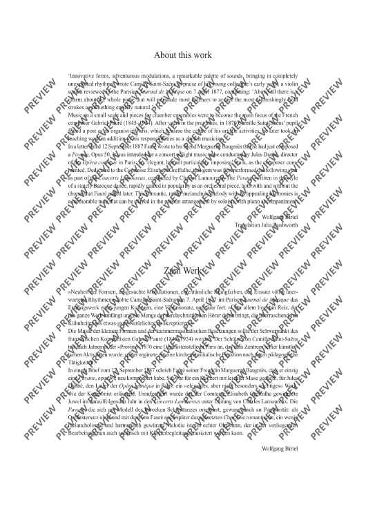 The music of small forms was what the French composer Gabriel Fauré (1845–1924) focused on. In 1874, after many years spent in the 'provinces', the teacher of Camille Saint-Saëns took the position of organist in Paris; later he not only worked as a church musician but also as a teacher. In the summer of 1887 Fauré wrote his Pavane Op. 50, originally intended for a concert providing light entertainment, which soon gained wide popularity as an orchestral setting with and without the chorus added by Fauré. The romantic, slightly melancholy melody is a catchy tune which, thanks to the present arrangement, can now also be performed soloistically with piano accompaniment.