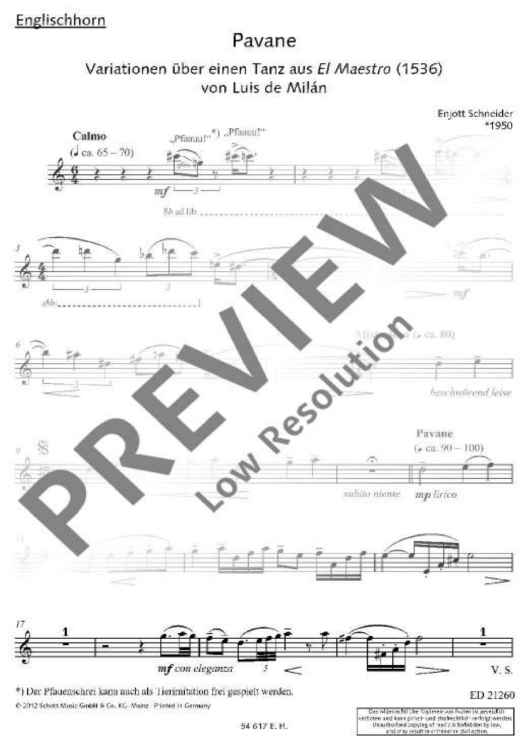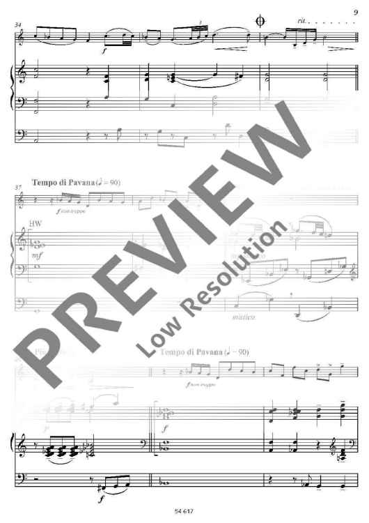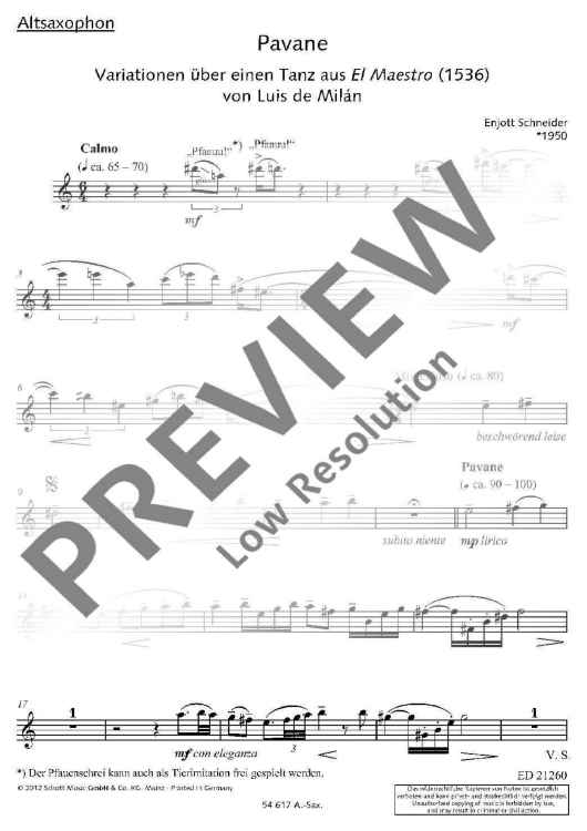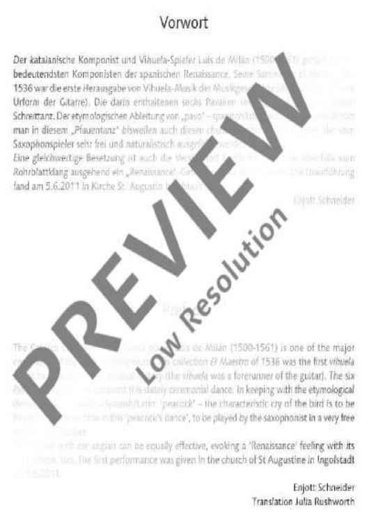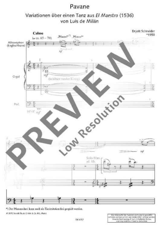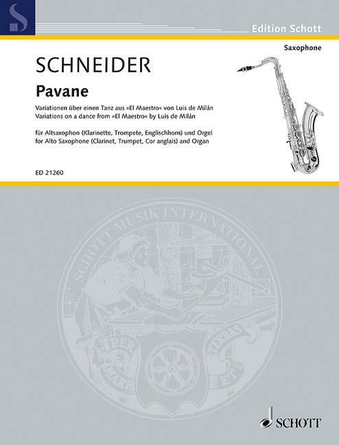 Literature for alto saxophone and organ is rare. In his piece, the composer Enjott Schneider from Munich examines a theme from the 16th century: The Catalan composer and vihuela player Luis de Milán (1500-1561) is one of the most important composers of the Spanisch Renaissance. His collection 'El Maestro' from 1536 was the first publication of vihuela music in music history, the vihuela being an archetype of the guitar. The six pavans contained therein embody the ceremonial processional dance. According to the etymological derivation of 'pavo' (Spanish/Latin: 'peacock'), one can sometimes even hear in this peacock's dance the typical cry of this bird which may be performed very freely and naturalistically by the saxophone player.