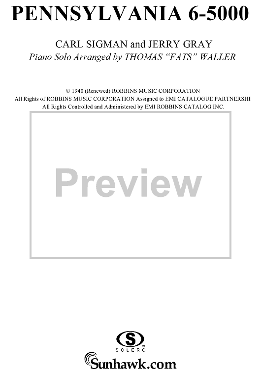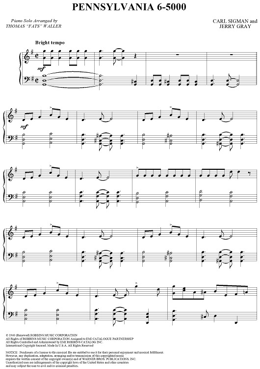 Digital Sheet Music for Pennsylvania 6-5000 by Carl Sigman, Fats Waller, Jerry Gray, Glenn Miller scored for Piano Solo; id:116368