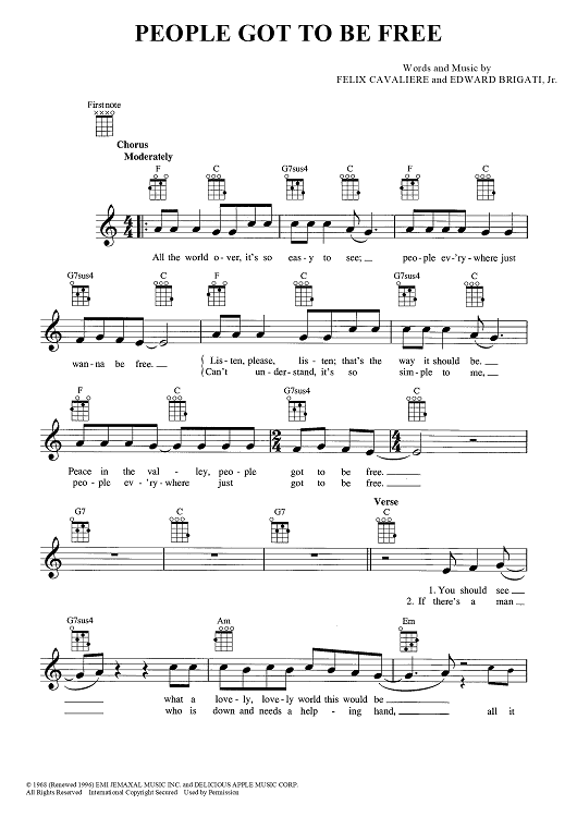 Digital Sheet Music for People Got To Be Free by Felix Cavaliere, The Rascals, Edward Brigati Jr. scored for Ukulele/Vocal; id:449177