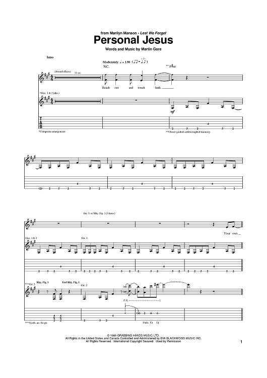 Digital Sheet Music for Personal Jesus by Johnny Cash, Martin Gore, Depeche Mode, Marilyn Manson scored for Guitar Tab; id:384630