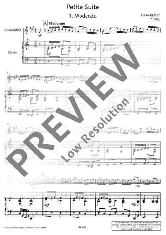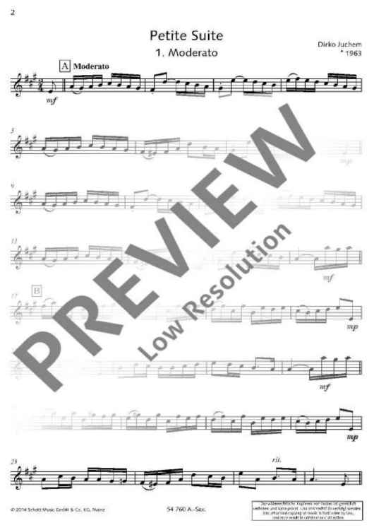 The saxophone player, arranger and composer Dirko Juchem wrote his 'Petite Suite' for music lessons and as easy performance piece for students' performances and competitions. The piece is easy to play and combines stylistic elements from light music with a basic concert attitude.