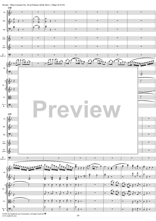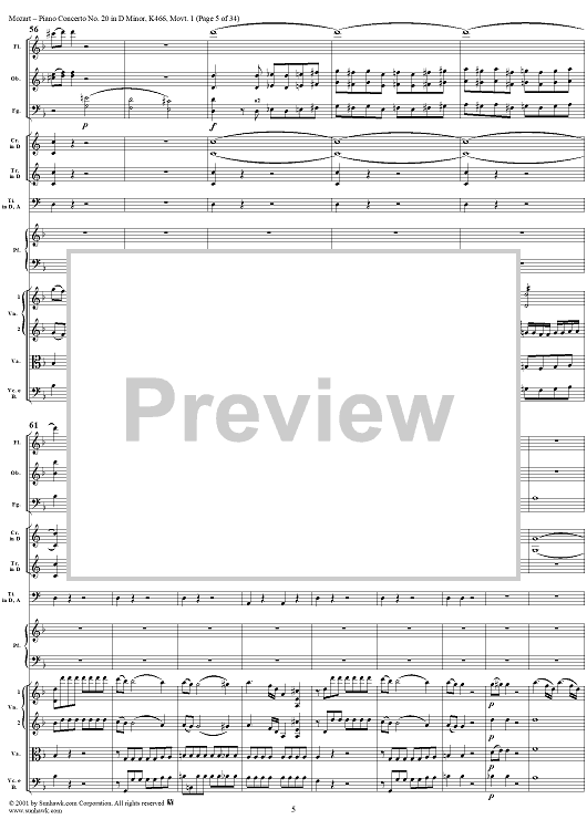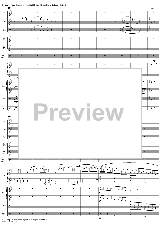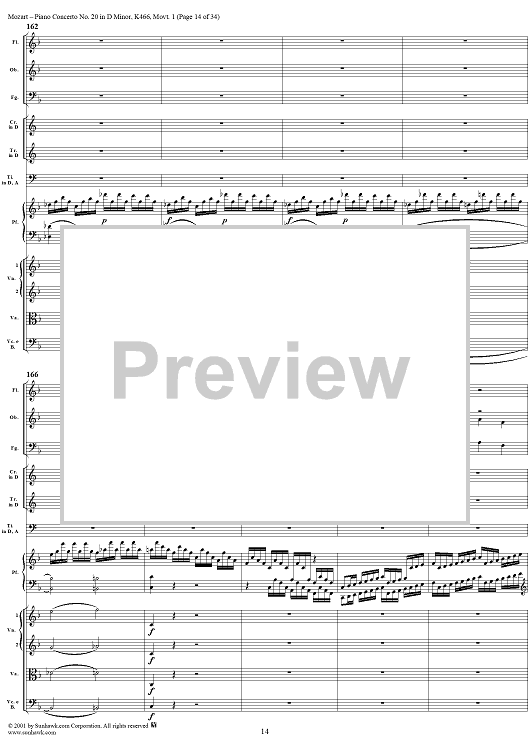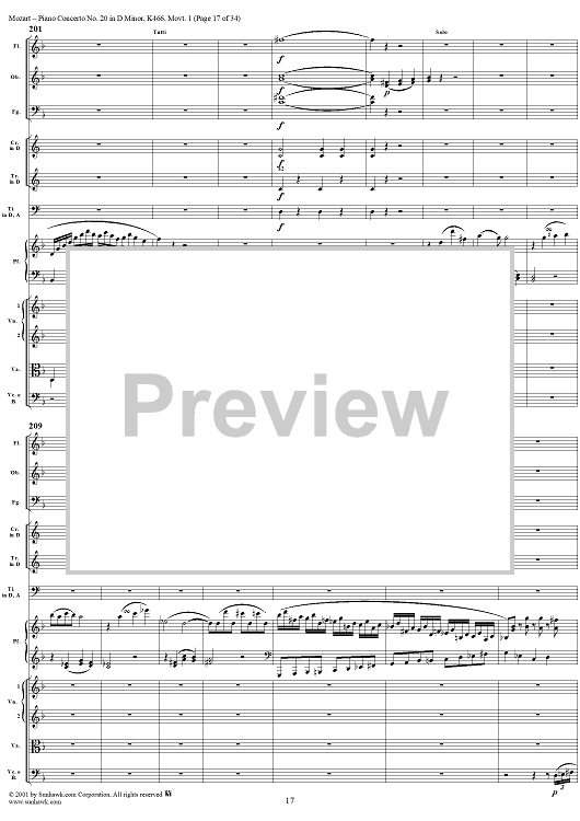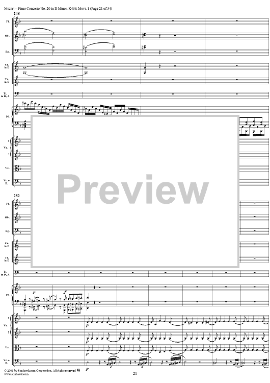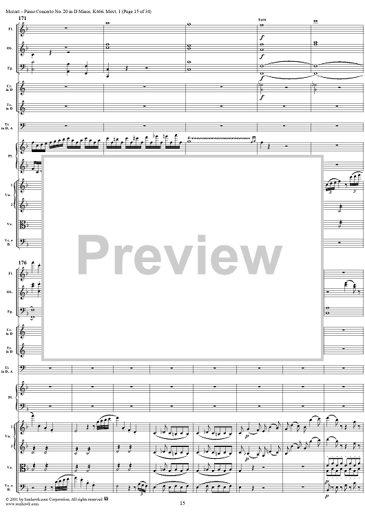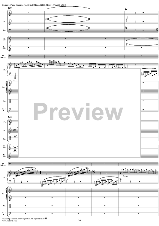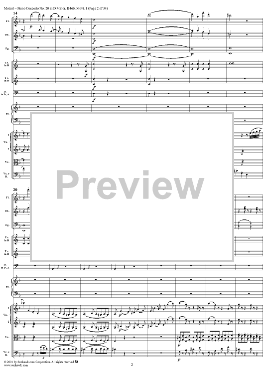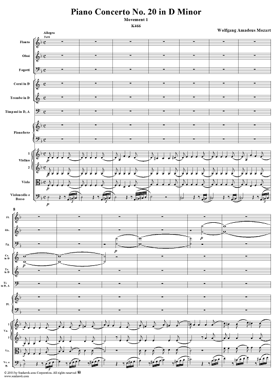 Digital Sheet Music for Piano Concerto No. 20 in D Minor, Movement 1 (K466) - Full Score by Wolfgang Amadeus Mozart scored for Piano and Orchestra; id:250377
