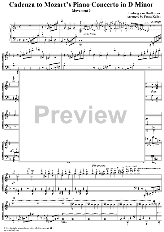 Digital Sheet Music for Piano Concerto no. 20 in D minor: Movement 3, Cadenza by Ludwig van Beethoven scored for Piano Solo; id:241186