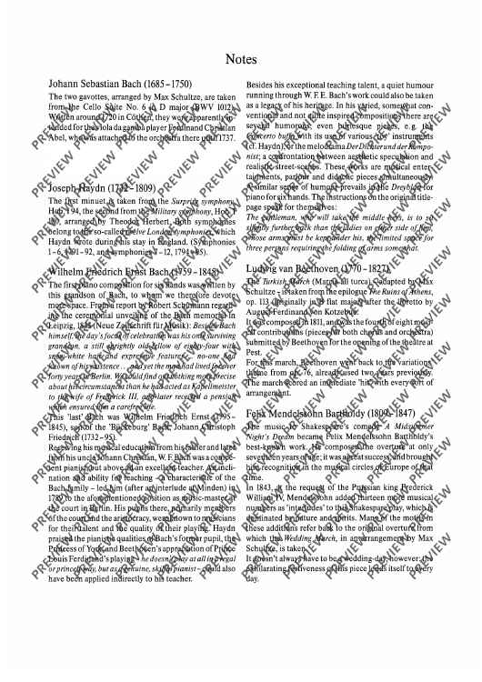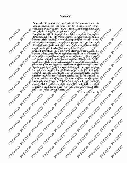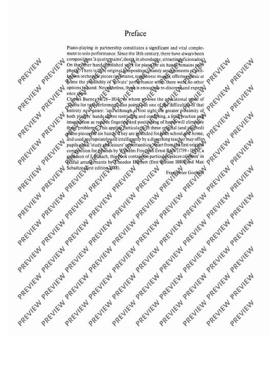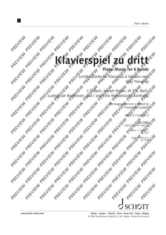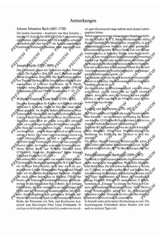 Charles Burney (1726-1814), to whom we owe the educational merit of 'Duets for two performers', also points out one of the difficulties of that entirely new genre: "and although at first sight the greater proximity of both players' hands seems restricting and confusing, a little practice and imagination as regards fingering and positioning of hands will eliminate these problems". This applies particularly to these original (and adapted) piano pieces for six hands. They are intended for both school and home, and used appropriately and intelligently by a discerning teacher may offer pupils equal 'study and leisure' opportunities. Apart from the first original compositon for six hands by Wilhelm Friedrich Ernst Bach (1759-1845), a grandson of J.S. Bach, this book contains in particular 'pièces célèbres' in skilful arrangements by Theodor Herbert (first edition 1880) and Max Schultze (first edition 1888). The edition is part of the Trinity syllabus 2007 (grades medium and advanced)