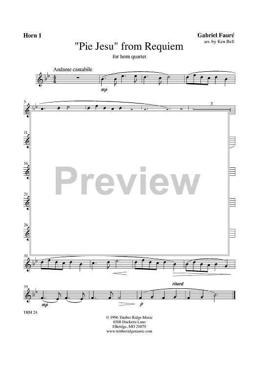 Digital Sheet Music for "Pie Jesu" from Requiem - Horn 1 by , Gabriel Fauré, Kenneth Bell scored for Horn Quartet; id:359478