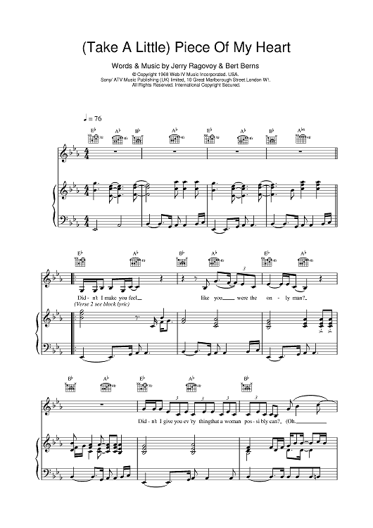 Digital Sheet Music for Piece Of My Heart by Bert Berns, Jerry Ragavoy, Erma Franklin scored for Piano/Vocal/Chords; id:376646