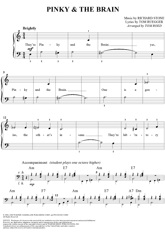 Digital Sheet Music for Pinky & the Brain by Tom Roed, Richard Stone, Tom Ruegger scored for Easy Piano/Vocal; id:259067