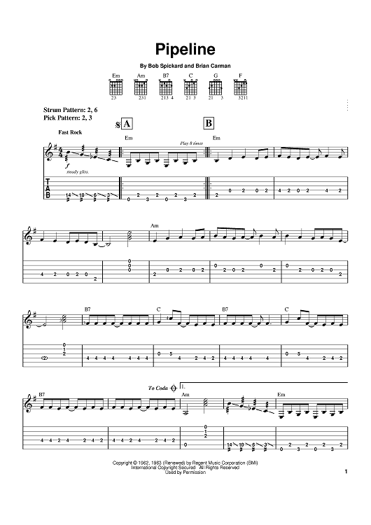 Digital Sheet Music for Pipeline by Bob Spickard, Stevie Ray Vaughan, The Ventures, Brian Carman, The Chantays scored for Easy Guitar Tab; id:371229