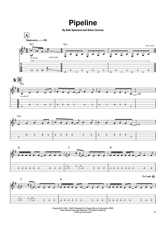 Digital Sheet Music for Pipeline by Bob Spickard, The Ventures, Johnny Thunders, Brian Carman, The Chantays scored for Guitar Tab; id:374733