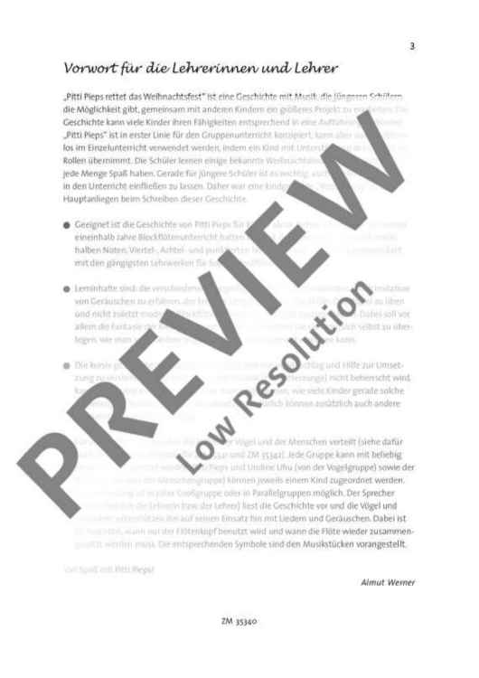 Pitti ist der kleinste Sprössling der Vogelfamilie Pieps und lebt in einer wunderschönen Tanne im Wald. Doch die Menschen bedrohen das Zuhause der Vögel, denn sie wollen die Bäume für das bevorstehende Weihnachtsfest fällen. Wie die Vögel ihren Wald retten und es für alle, Mensch und Tier, ein fröhliches Weihnachtsfest wird, erfahrt Ihr in dieser Geschichte. Nach "Das kleine Gespenst Huschwusch" (ZM 34860) hier nun eine neue Geschichte von Almut Werner, wiederum gut geeignet für die szenische Aufführung in der Schule oder Musikschule für Kinder ab 7 Jahren nach ca. eineinhalb Jahren Blockflötenunterricht.