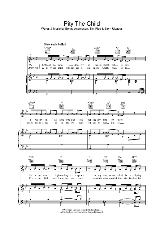 Digital Sheet Music for Pity The Child by Tim Rice, Benny Andersson, Bjorn Ulvaeus scored for Piano/Vocal/Chords; id:390935
