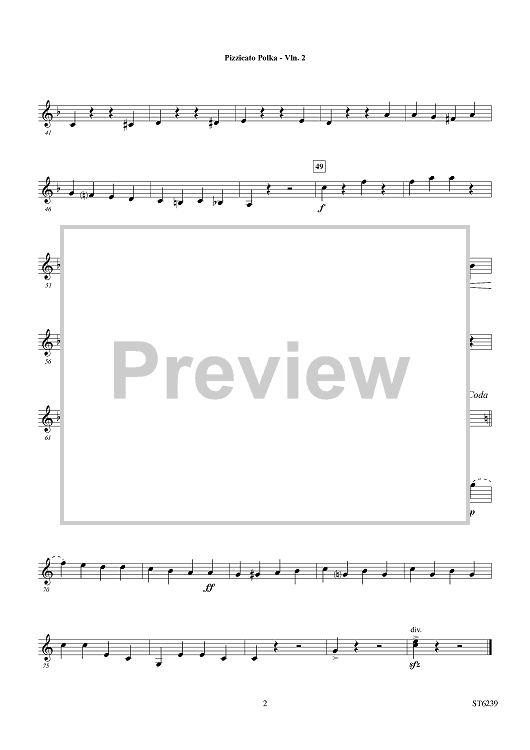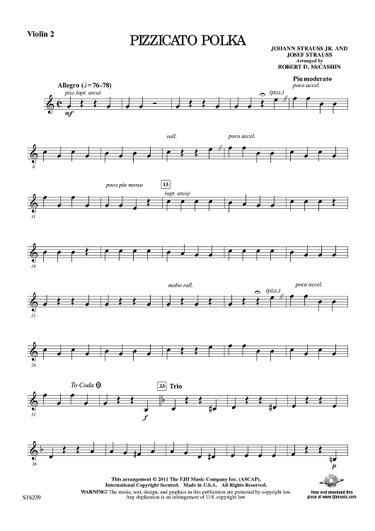 Digital Sheet Music for Pizzicato Polka - Violin 2 by Josef Strauss, Robert D. McCashin, Johann Strauss, Jr. scored for String Orchestra; id:421921