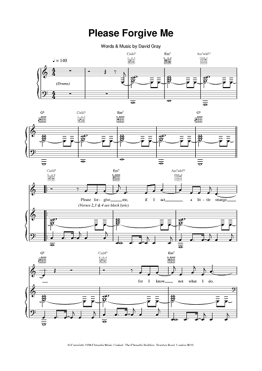 Digital Sheet Music for Please Forgive Me by David Gray scored for Piano/Vocal/Chords; id:377072