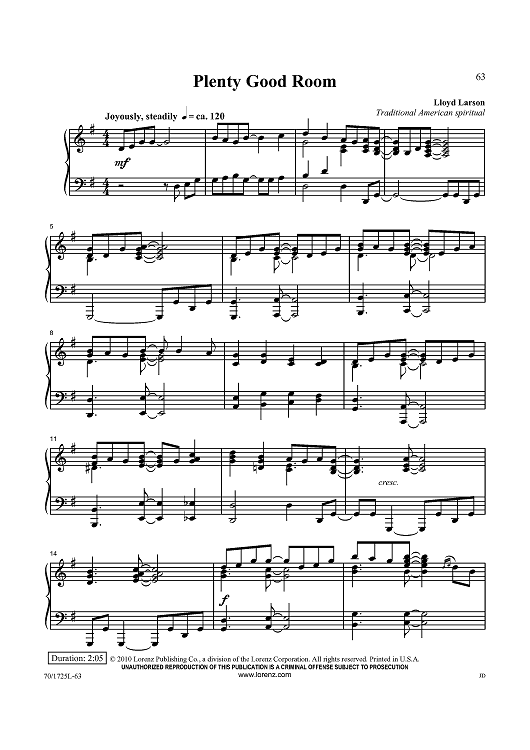 Digital Sheet Music for Plenty Good Room by Lloyd Larson, Traditional American Spiritual scored for Piano Solo; id:433640